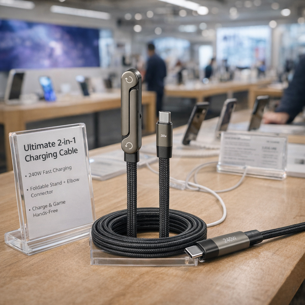 The Ultimate 2-in-1 Charging Cable combines 240W fast charging with a built-in foldable phone holder, so your device stays powered and perfectly positioned.